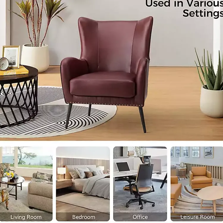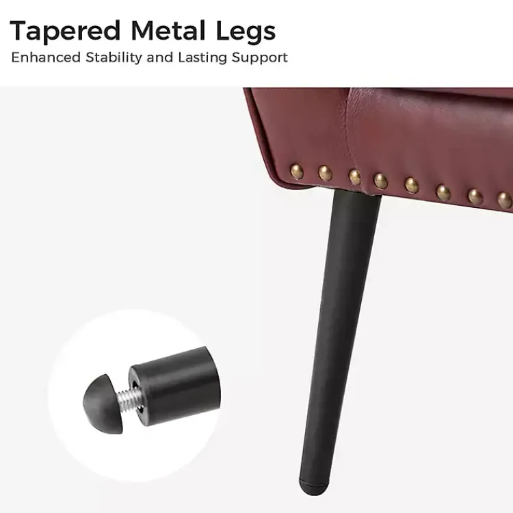 An exquisite wingback and gorgeous nailhead detailing bring vintage appeal to this Burgundy Faux Leather Accent Chair. Its classic, luxe design and rich burgundy finish will look perfect in a living room.