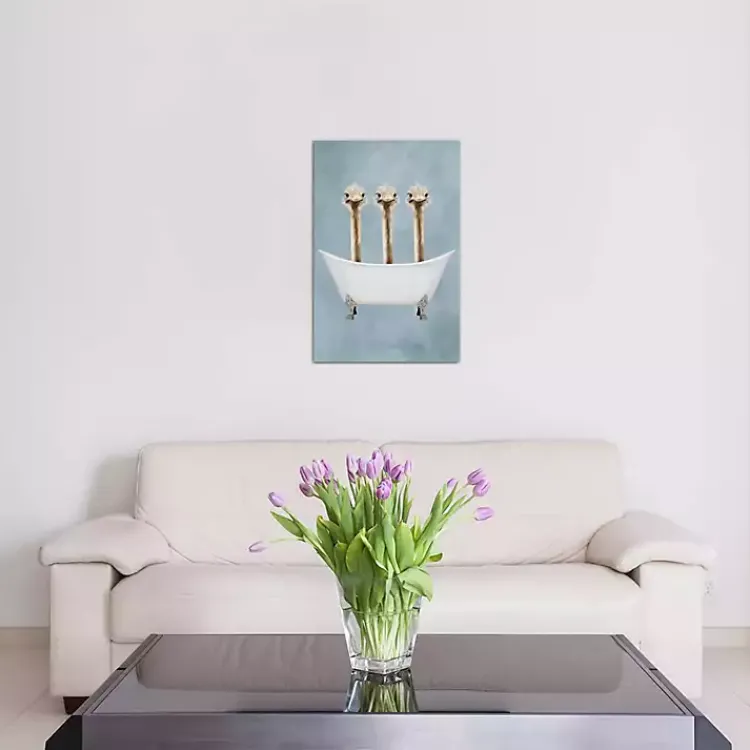 Three cute ostriches are washing up in this unique Ostriches in Bath Tub Canvas Art Print. It adds a whimsical touch into your existing bathroom decor.