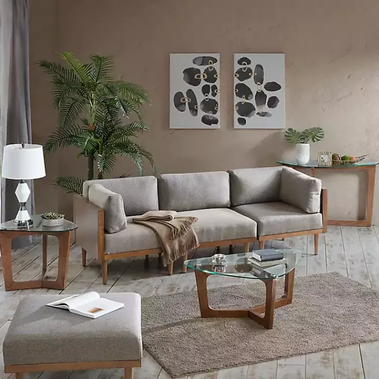 Add a striking mid-century look to your home with this Glass Triangular Walker Coffee Table! The solid wood frame features a warm pecan finish and supports a tempered glass tabletop, creating a clean and open look.