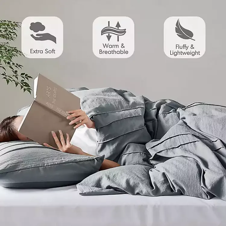 Our Blue Gray Pleated Grid 3-pc. Queen Comforter Set strikes the perfect balance between being fluffy and lightweight. Enjoy cozy nights in the winter and refreshing breathable comfort in the summer!