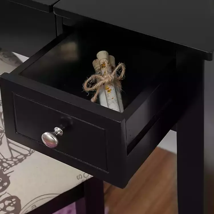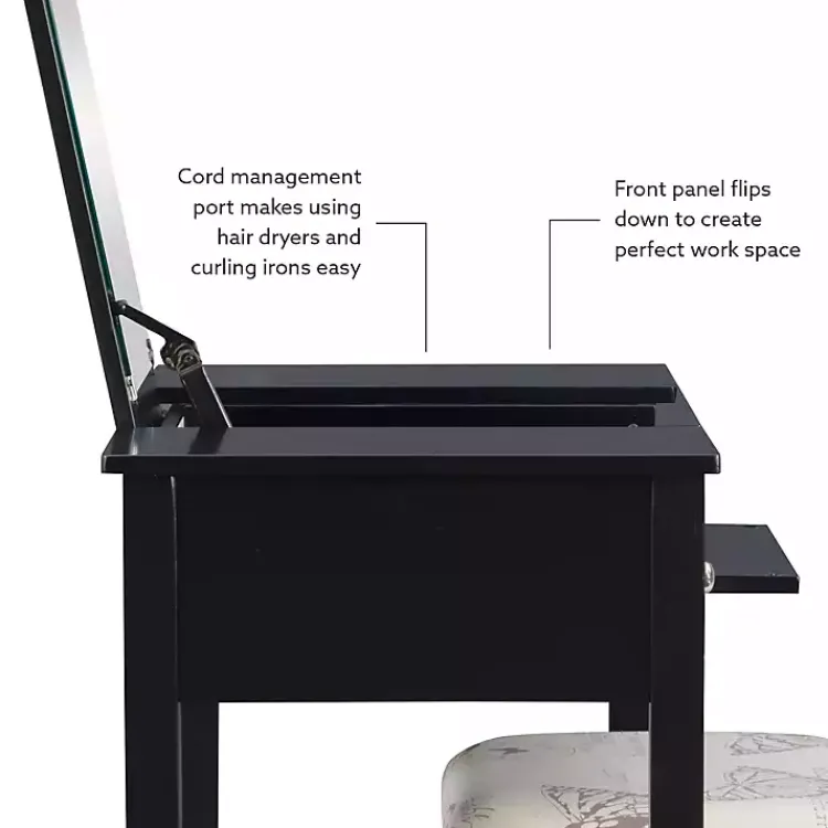 Constructed of solid wood, this Black Virginia Butterfly Vanity Set includes a matching stool upholstered with a unique butterfly print on linen fabric. With two drawers and a lift top mirror, you’ll find ample storage for beauty supplies!