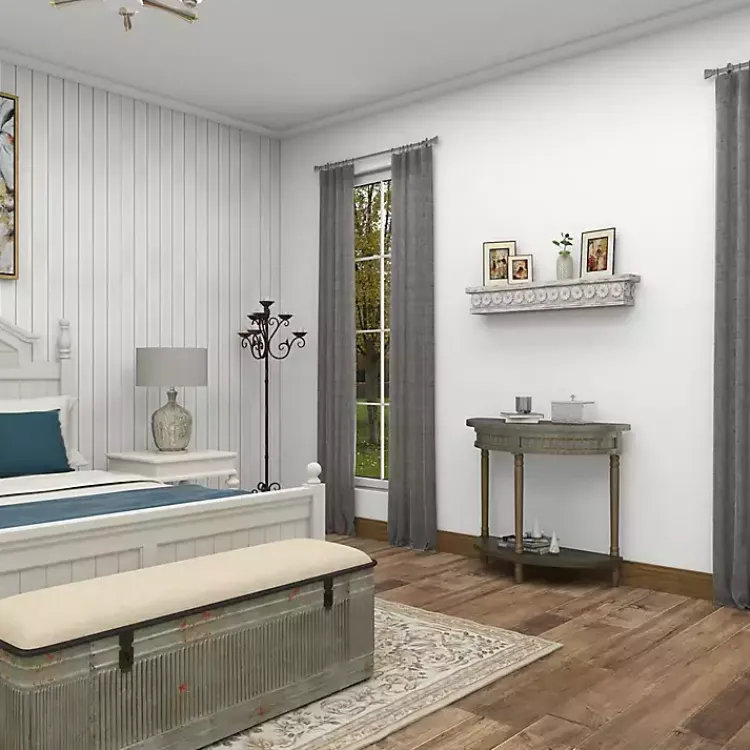 Embrace the beautifully carved design of our Ornate Farmhouse Wooden Wall Shelf. Its white washed finish and repeating floral will be sure to warm your entryway décor.