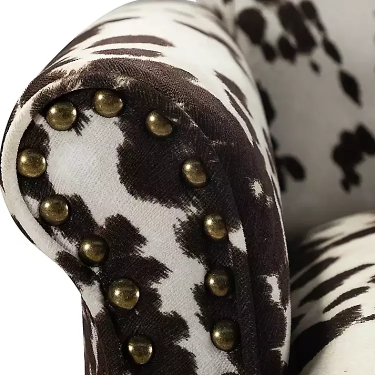 This Brown Cow Print Upholstered Accent Chair is the perfect way to incorporate farmhouse-glam into your décor. With its carved turned legs, nailhead trim, and animal print design, it will be the statement piece of any room!