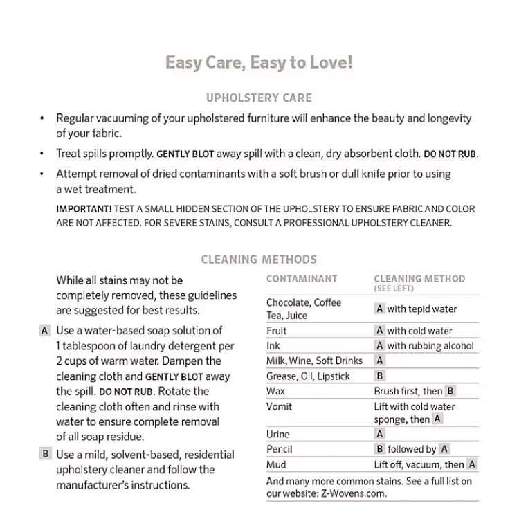 - Care: Treat spillspromptly. Vacuum regularly to enhance the beauty and longevity of thefabric. For severe stains, consult a professional upholstery cleaner.