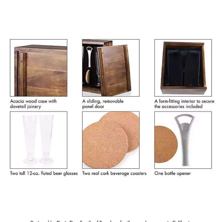 - Set includes two (2) fluted beer glasses, two (2) coasters, and one (1) bottle opener