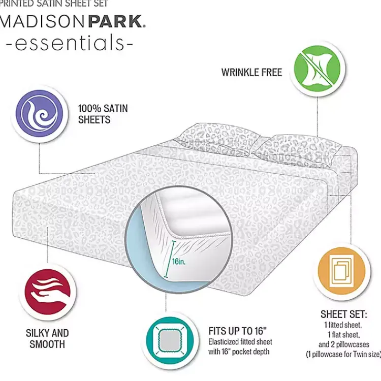 Treat yourself and your bedroom with the elegance of our Taupe Leopard Print Satin 3-pc. Twin Sheet Set. These luxury, wrinkle-free satin sheets are silky smooth to the touch and feature a glamorous animal print that elevates the style and comfort of your bed.