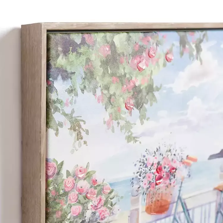Take an adventure along the coast with this Bike on the Boardwalk Framed Canvas Art Print. Its bright colors and floral accents are sure to add life to your walls!