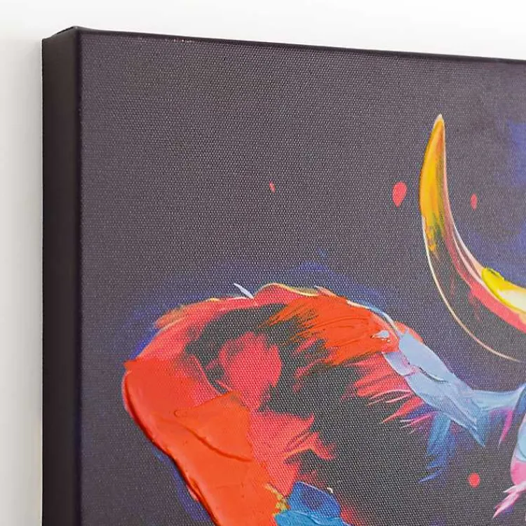 Showcase your whimsical farmhouse style with our Colorful Moo Canvas Art Print! The colorful creature emerges from the shadows, making a bold, dramatic presence.