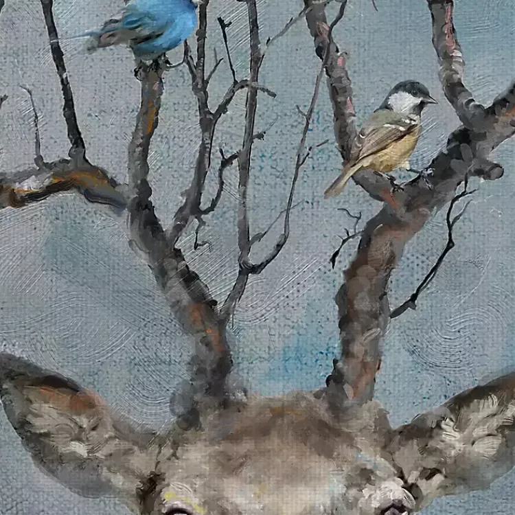 - Features a deer with birds in its antlers subject