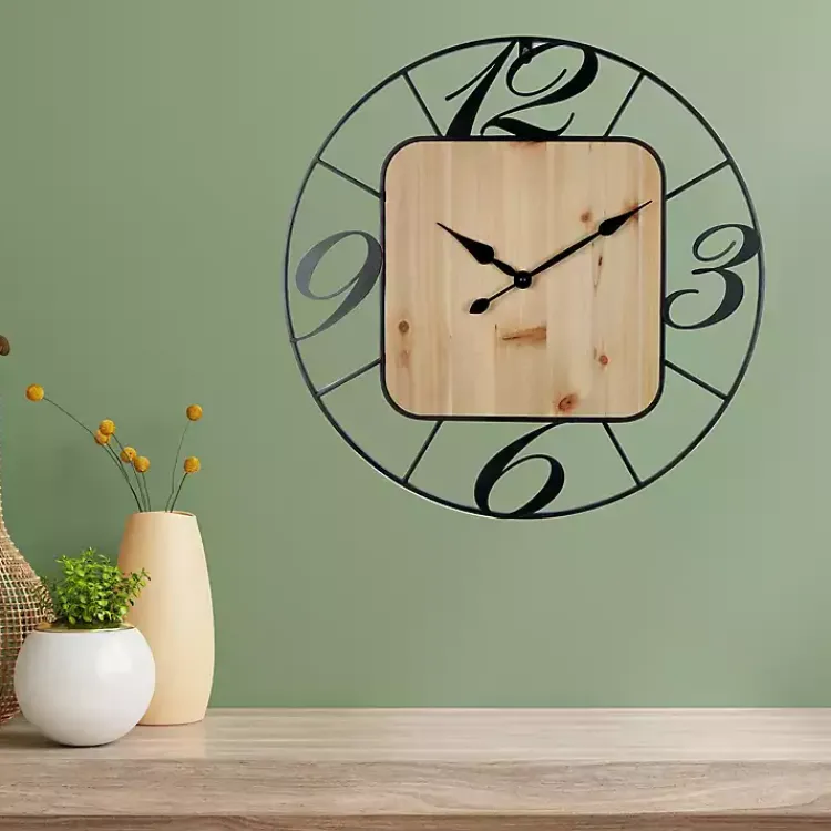 Clock measures 23.5L x 23.5H in.Crafted of metal and woodBlack finishOpen clock face with a natural wood sqaure centerBa…