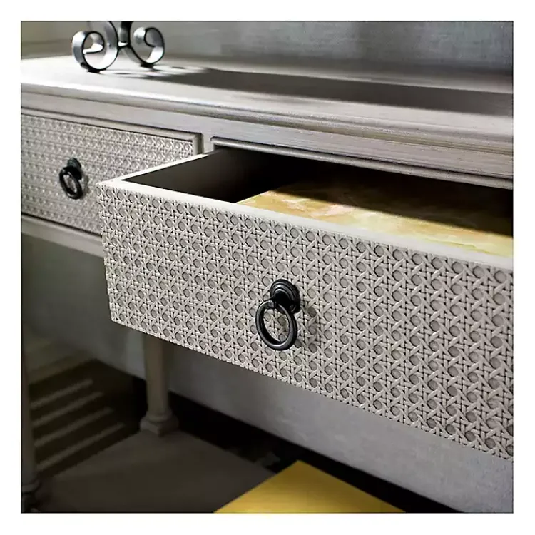 Update your living space with cool, contemporary style using this Natural Textured 2-Drawer Console Table! You’ll love how the carved details and ring drawer pulls modernize its classic design.