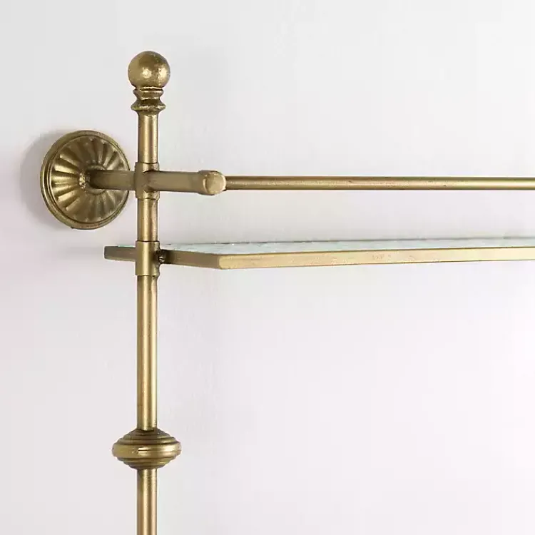 Shelf measures 22.25L x 6.5W x 17.25H in.Crafted of iron and glassGold metal frame finishTextured glass shelves2-tier de…