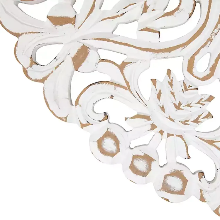 Accent your farmhouse décor with this Antique White Damask Round Wall Plaque! The antique white finish is perfect for achieving a rustic look. You’ll love the carved ornate details in your entryway or living space!